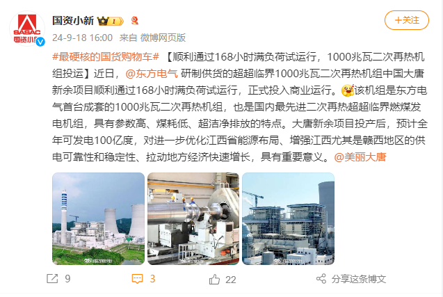 [国资小新]#最硬核的国货购物车# 【顺遂通过168小时满负荷试运行, ,,, ,,1000兆瓦二次再热机组投运】