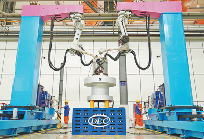 2022年叶片加工“黑灯产线”建成,,,,,叶片质量及格率达99%,,,,,人均效率提升650%;;;;;;;;在焊接数字化车间,,,,,依托智能机械人,,,,,一次焊接及格率靠近100%。 。。。。