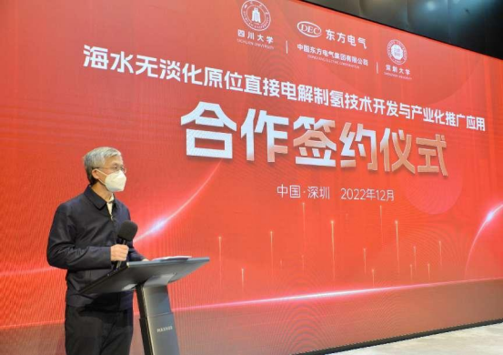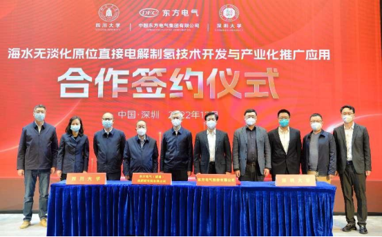 本网讯  12月16日,, ,,,,中国工程院院士谢清静领衔指导的四川大学、深圳大学博士团队与6731顶级娱乐股份有限公司、6731顶级娱乐(福建)立异研究院有限公司在深圳签署“海水无淡化原位直接电解制氢原创手艺中试和工业化推广应用”的四方合作协议。。 。。。。中国工程院院士谢清静,, ,,,,6731顶级娱乐集团党组成员、副总司理张彦军,, ,,,,深圳大学副校长汪永成等出席签约仪式。。 。。。。