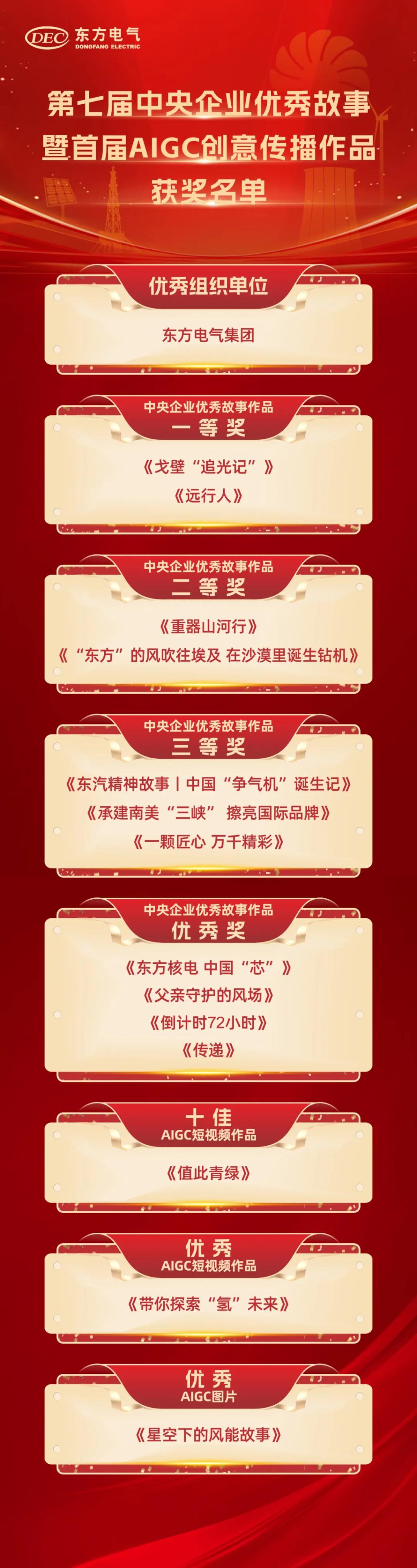其中,,,,,《沙漠“追光记”》《远行人》荣获中央企业优异故事作品一等奖,,,,,《重器山河行》《“东方”的风吹往埃及 在沙漠里降生钻机》荣获中央企业优异故事作品二等奖,,,,,《东汽精神故事丨中国“争气机”降生记》《承建南美“三峡”擦亮国际品牌》《一颗匠心 万千精彩》荣获中央企业优异故事作品三等奖,,,,,《东方核电 中国“芯”》《父亲守护的风场》《倒计时72小时》《转达》荣获中央企业优异故事作品优异奖,,,,,《值此青绿》获评十佳AIGC短视频作品,,,,,《带你探索“氢”未来》获评优异AIGC短视频作品,,,,,《星空下的风能故事》获评优异AIGC图片。。。。。。